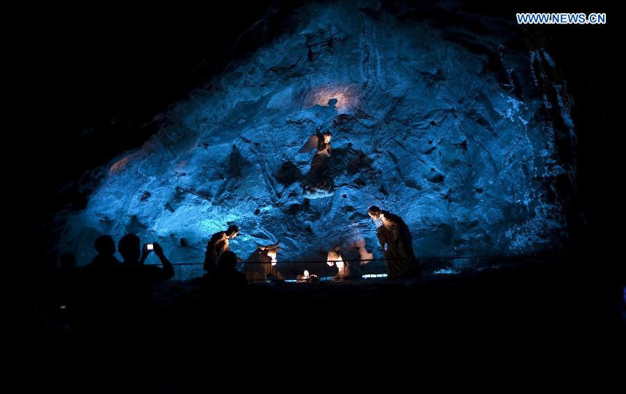 Image taken on Sept. 12, 2011 shows tourists visiting the Salt Cathedral in Zipaquira Town, Colombia. The Salt Cathedral is a church built in the tunnels of a salt mine, 200 meters underground. Chinese Premier Li Keqiang started on May 18 his nine-day Latin American trip including Brazil, Colombia, Peru and Chile. (Xinhua/Eliana Aponte)
