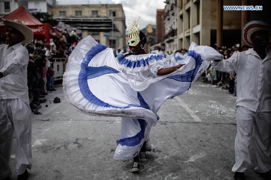 Image taken on Jan. 3, 2014 shows artists with traditional outfits taking part in a parade in Pasto City, Colombia. Chinese Premier Li Keqiang started on May 18 his nine-day Latin American trip including Brazil, Colombia, Peru and Chile. (Xinhua/Jhon Paz)