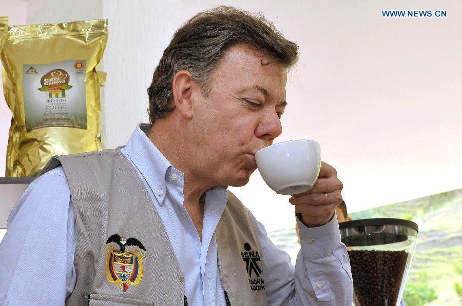 Image provided by the Colombian Presidency shows Colombian President Juan Manuel Santos drinking coffee during the inauguration of the Coffee Plaza in Genova Municipality of Quindio Department on Sept. 1, 2012. Colombia is one of the largest coffee exporters in the world. Chinese Premier Li Keqiang started on May 18 his nine-day Latin American trip including Brazil, Colombia, Peru and Chile. (Xinhua/Colombia's Presidency)