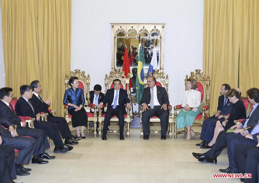 Chinese Premier Li Keqiang (2nd L Center) meets with Rio de Janeiro Governor Luiz Fernando Pezao (2nd R Center) in Rio De Janeiro, Brazil, May 20, 2015. (Xinhua/Ding Lin)