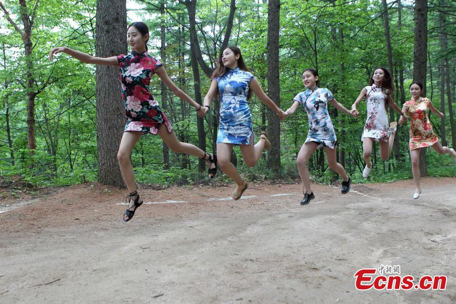 College students wearing cheongsam (qipao) pose for photos during an event to raise awareness of the need for harmony between nature and human beings at a national forest park in Luanchuan county, Central China’s Henan province, May 21, 2015. The photo was taken with a high shutter speed to freeze people’s jumps. (Photo: China News Service/Wang Zhongju)