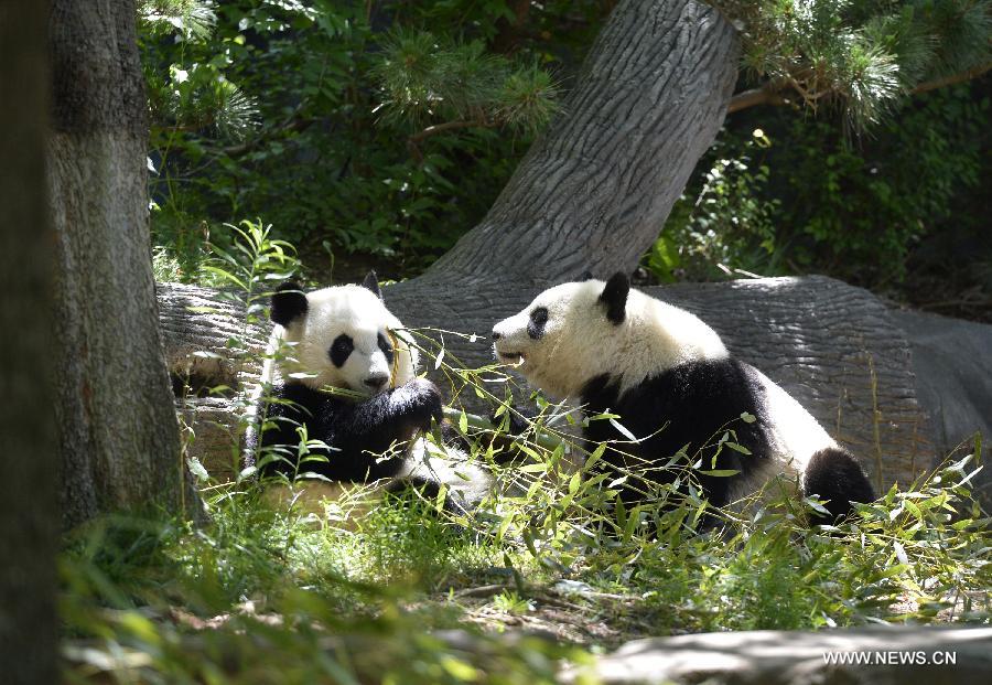 Photo taken on May 22, 2015 shows giant panda twins Mei Lun and Mei Huan at Zoo Atlanta, Georgia, United States. Born on July 15, 2013, Giant panda twins Mei Lun and Mei Huan at Zoo Atlanta are the first surviving pair of panda twins ever born in the United States. They are weaned and now occupy a separate habitat from their mother Lun Lun. (Xinhua/Wang Lei)