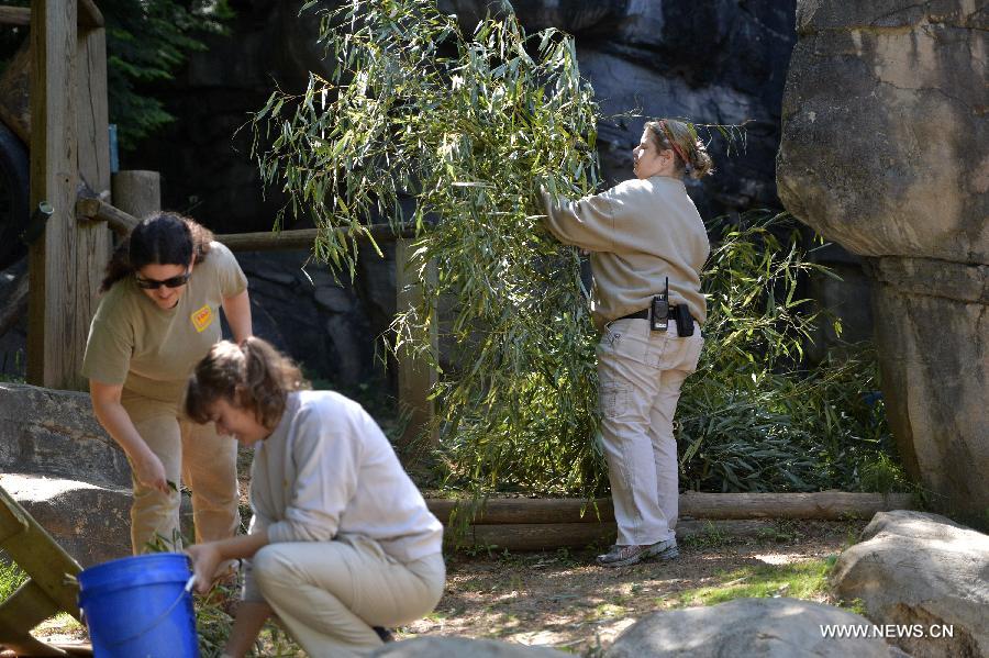 Photo taken on May 22, 2015 shows the staff members cleaning dwelling of giant panda twins Mei Lun and Mei Huan at Zoo Atlanta, Georgia, United States. Born on July 15, 2013, Giant panda twins Mei Lun and Mei Huan at Zoo Atlanta are the first surviving pair of panda twins ever born in the United States. They are weaned and now occupy a separate habitat from their mother Lun Lun. (Xinhua/Wang Lei)