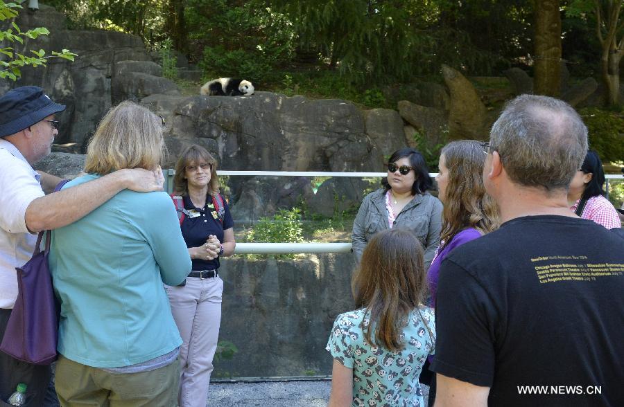 People visit giant panda twins Mei Lun and Mei Huan at Zoo Atlanta, Georgia, United States on May 22, 2015. Born on July 15, 2013, Giant panda twins Mei Lun and Mei Huan at Zoo Atlanta are the first surviving pair of panda twins ever born in the United States. They are weaned and now occupy a separate habitat from their mother Lun Lun. (Xinhua/Wang Lei)