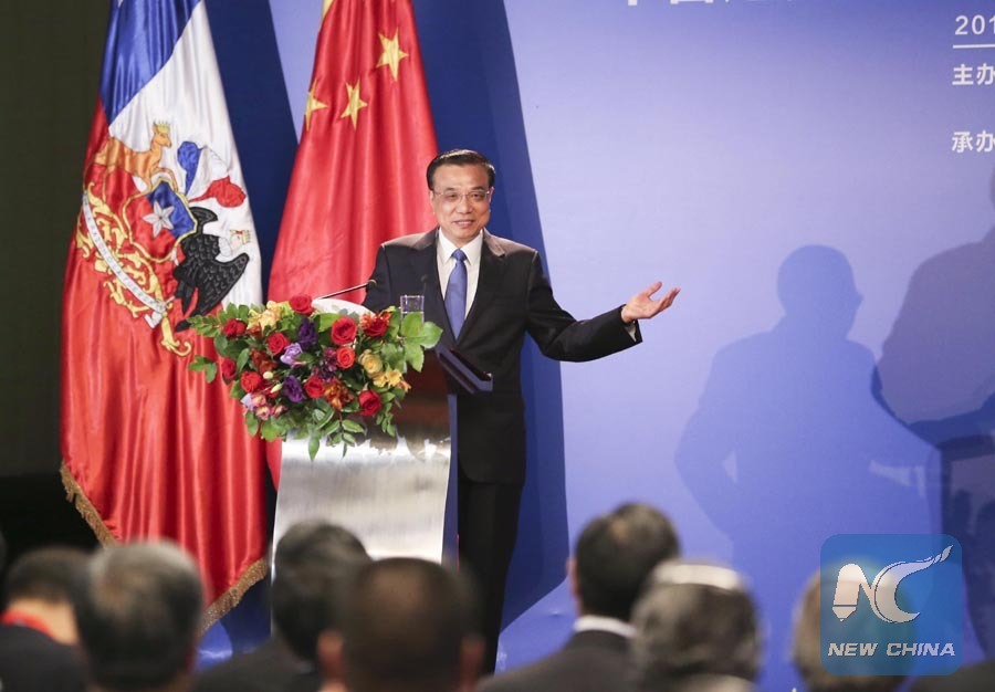| Chinese Premier Li Keqiang addresses the opening of an economic and trade seminar marking the 45th anniversary of the establishment of China-Chile diplomatic relations and the seventh meeting of the China-Chile Business Council in Santiago, capital of Chile, May 26, 2015. (Xinhua/Ding Lin) |