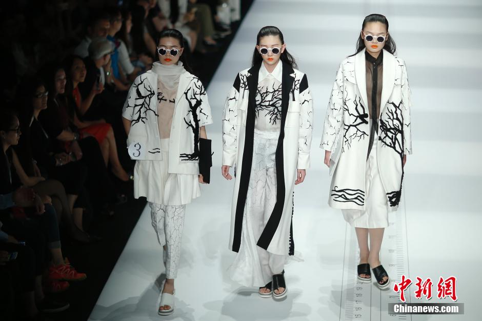 Models show newly designed clothes on T-stage on May 20, 2015. The 20th "Joeone" Newcomer of Chinese Clothing Design Competition was held in Beijing. A total of 625 graduates from 72 colleges and universities in China participated in the competition. A total of 49 participators from 44 colleges and universities qualified the final. (CNS/Sheng Jiapeng)