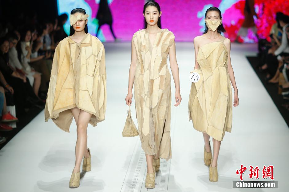 | Models show newly designed clothes on T-stage on May 20, 2015. The 20th "Joeone" Newcomer of Chinese Clothing Design Competition was held in Beijing. A total of 625 graduates from 72 colleges and universities in China participated in the competition. A total of 49 participators from 44 colleges and universities qualified the final. (CNS/Sheng Jiapeng) |