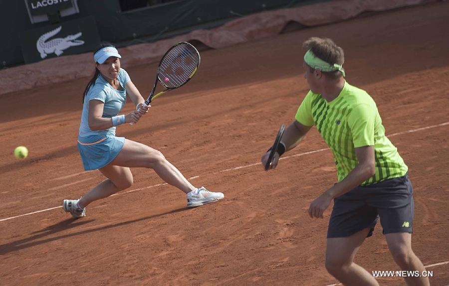 | Zheng Jie (L) of China and Henri Kontinen of Finland compete during the mixed doubles semifinal against Lucie Hradecka of the Czech Republic and Marcin Matkowski of Poland at 2015 French Open tennis tournament in Paris, France on June 3, 2015. Zheng Jie and Henri Kontinen lost 0-2. (Xinhua/Chen Xiaowei) |