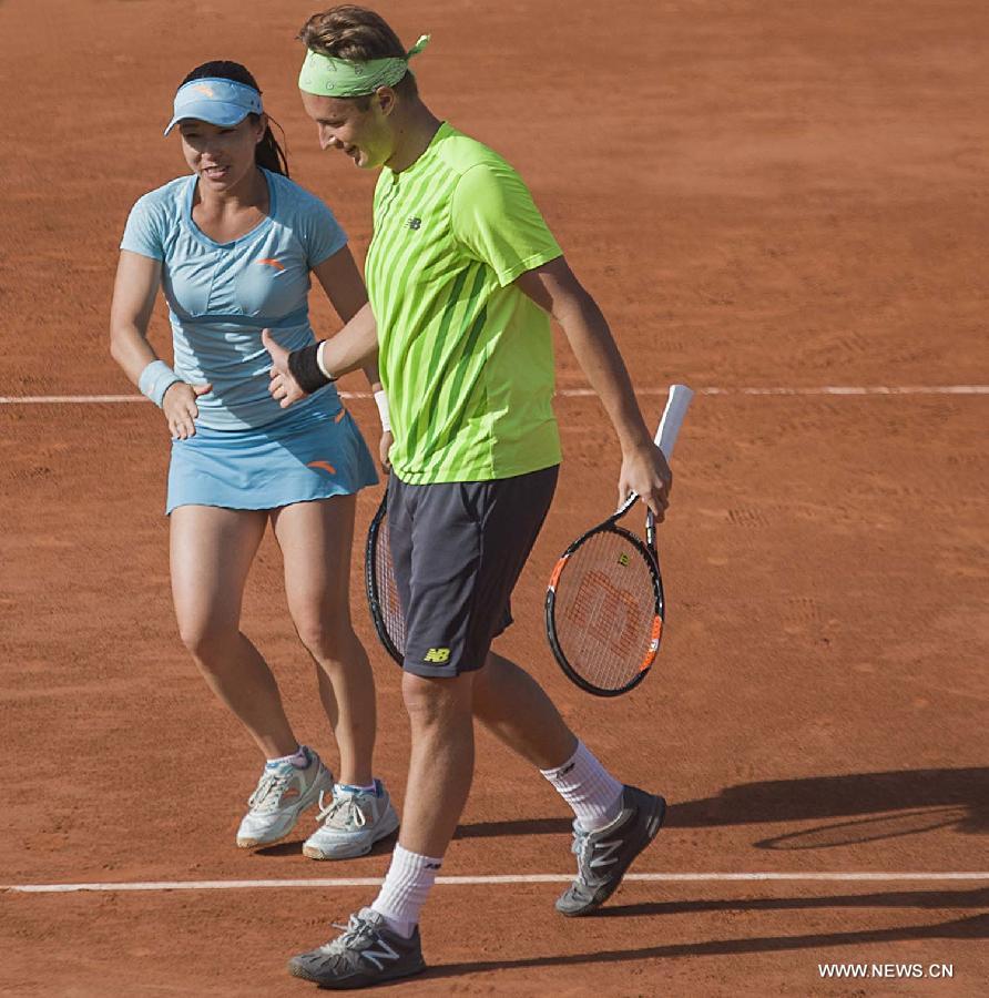Zheng Jie (L) of China and Henri Kontinen of Finland compete during the mixed doubles semifinal against Lucie Hradecka of the Czech Republic and Marcin Matkowski of Poland at 2015 French Open tennis tournament in Paris, France on June 3, 2015. Zheng Jie and Henri Kontinen lost 0-2. (Xinhua/Chen Xiaowei)