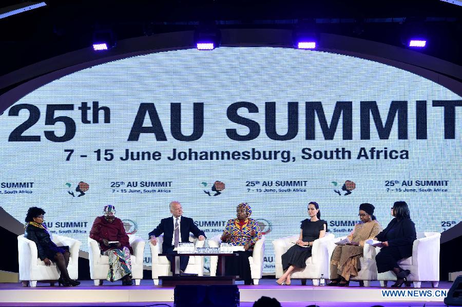 | Hollywood actress Angelina Jolie (R) speaks with African Union (AU) Commission Chairwoman Nkosazana Dlamini-Zuma at a panel discussion during the 25th AU Summit in Johannesburg, South Africa, on June 12, 2015. Hollywood actress Angelina Jolie, acting in her capacity as the United Nations envoy on refugee issues, on Friday called for an end to violence against women. (Xinhua/DIRCO/Jacoline Schoonees) |