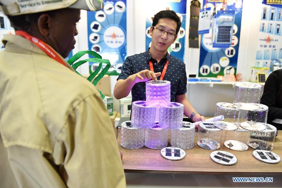 A Chinese exhibitor introduces a solar inflatable light to a visitor during the China Trade Week held at Kenyatta International Conference Centre in Nairobi, Kenya, July 1, 2015. Kenya kicked off a three-day exhibition in Nairobi on Wednesday to woo Chinese business community to invest in diverse sectors of the economy. (Xinhua/Sun Ruibo)