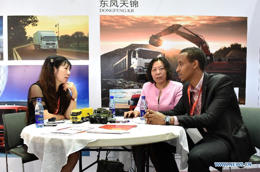 A local businessman talks with Chinese exhibitors during the China Trade Week held at Kenyatta International Conference Centre in Nairobi, Kenya, July 1, 2015. Kenya kicked off a three-day exhibition in Nairobi on Wednesday to woo Chinese business community to invest in diverse sectors of the economy. (Xinhua/Sun Ruibo)