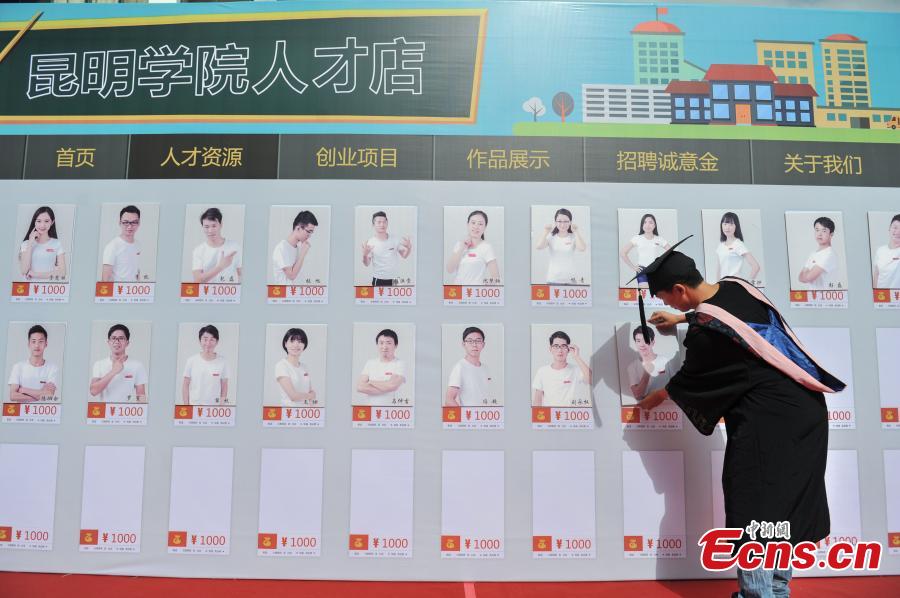 Kunming University has opened a store on taobao.com, China's largest business-to-consumer platform backed by e-commerce giant Alibaba, to promote this year's graduates. The university’s online store now provides information on 65 graduates from different majors, including details of their job expectations. Employers interested in the graduates can pay a 1,000 yuan deposit to begin further talks or interviews under the coordination of the university. The job market is tough this year, and only 52 percent of graduates from Kunming University have secured a job. The online store aims to introduce graduates to more employers, says Liu Juanjuan, the vice director of the President’s Office at Kunming University. (Photo: China News Service/Ren Dong)