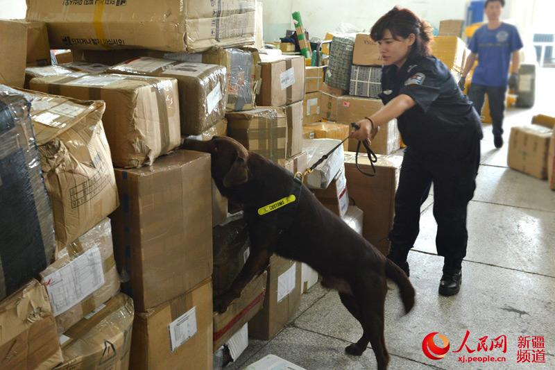 | Tong Xinyuan and sniffer dog 'coffee' have tacit cooperation at work. (People's Daily Online/Li Xiaoxiao) |