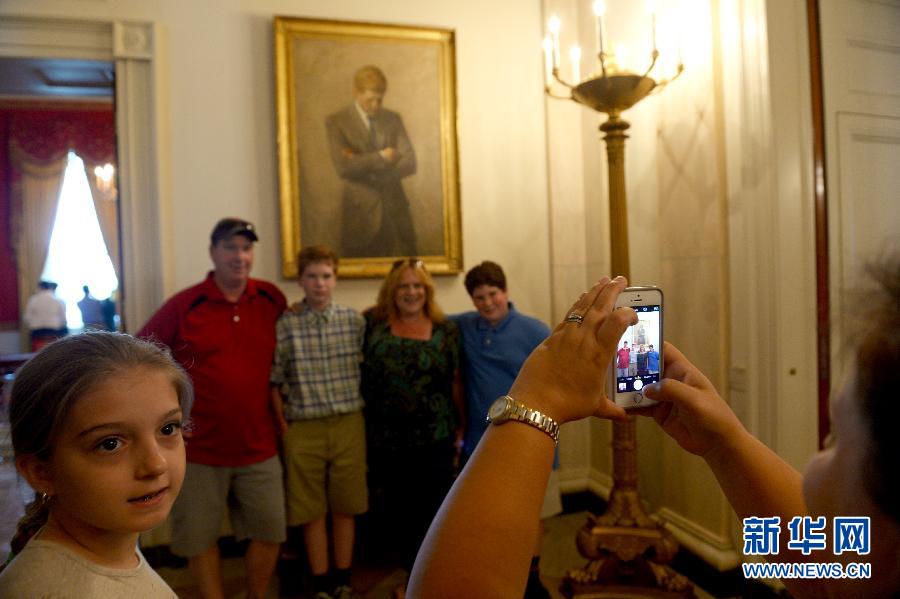 Tourists take photos in front of the portrait of former President John Kennedy, July 1, 2015. (Xinhua/Yin Bo).