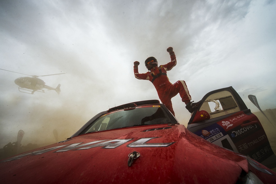 Han Wei celebrates the victory of his fleet in China Around Taklimakan (International) Rally on July 1, 2015. (Xinhua/ Jiang Wenyao)