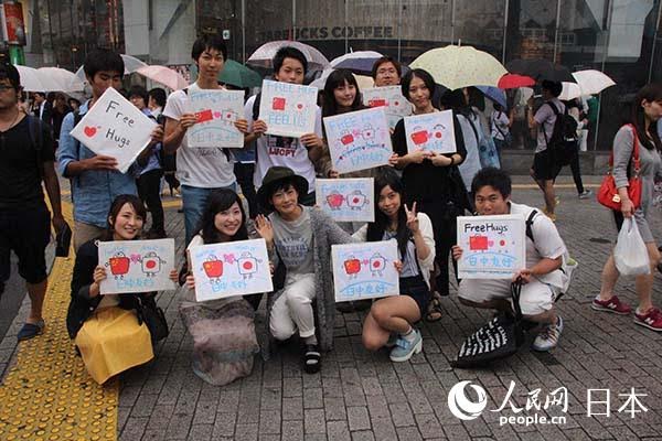 On July 5th, more than a dozen young adults from China and Japan gathered at Shibuya, one of the most bustling streets in Tokyo. They carried out a campaign called the “Chinese-Japanese friendship hug.” Chinese students studying in Japan sponsored the activities. They held “Chinese-Japanese friendship” signs on the street and hugged passersby in order to demonstrate the everlasting friendship between China and Japan. (Reported by People's Daily Online Japan, original story link http://japan.people.com.cn/n/2015/0706/c35467-27257636.html)