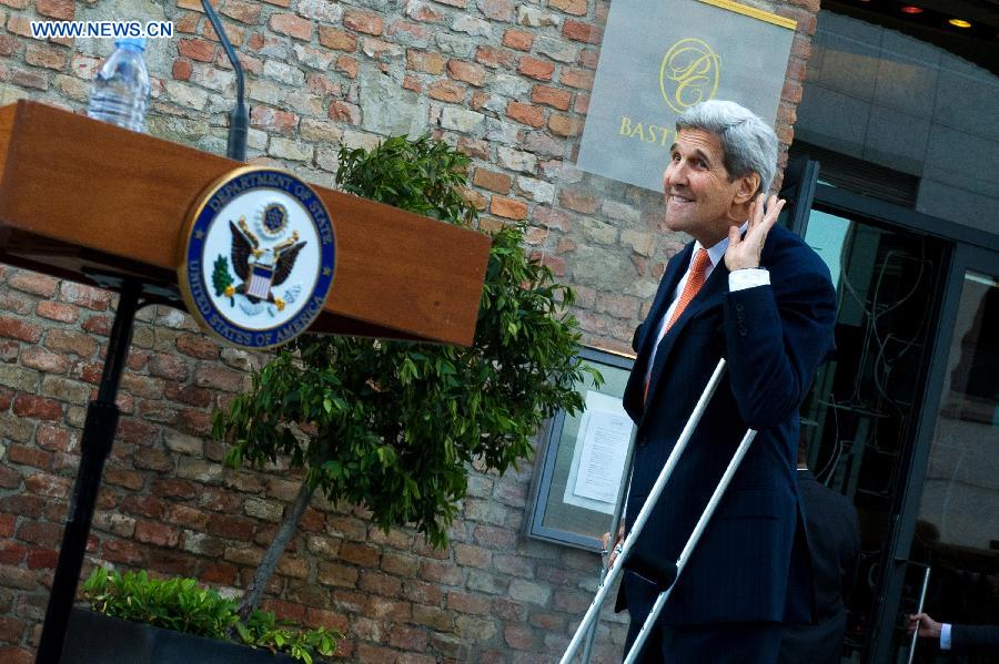 | U.S. Secretary of State John Kerry speaks during a press conference in front of Palais Coburg where the Iran nuclear talks take place, in Vienna, Austria, July 9, 2015. John Kerry on Thursday said some of the tough issues remain unresolved in the ongoing nuclear talks here, saying hard decisions must be taken very soon. (Xinhua/Qian Yi) |