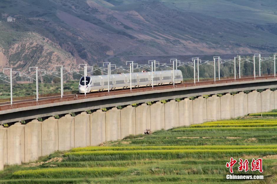 A CRH (China Railway High-speed) bullet train travels on the Lanxing (Lanzhou-Xinjiang) High-speed Railway. In this train, passengers can view millions of acres of canola field in full bloom and beautiful grasslands under the blue sky. (CNS Photo)