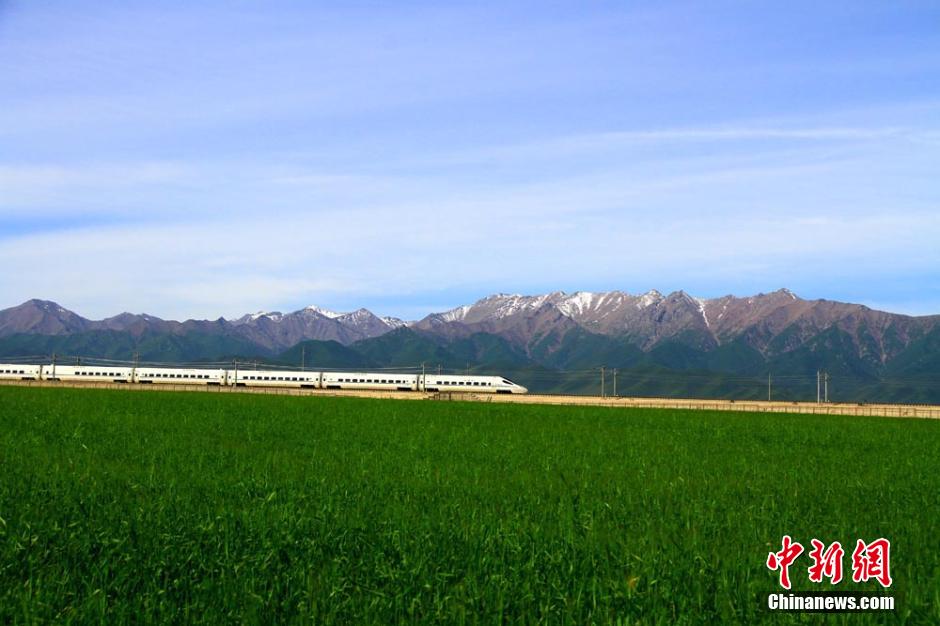 A CRH (China Railway High-speed) bullet train travels on the Lanxing (Lanzhou-Xinjiang) High-speed Railway. In this train, passengers can view millions of acres of canola field in full bloom and beautiful grasslands under the blue sky. (CNS Photo)