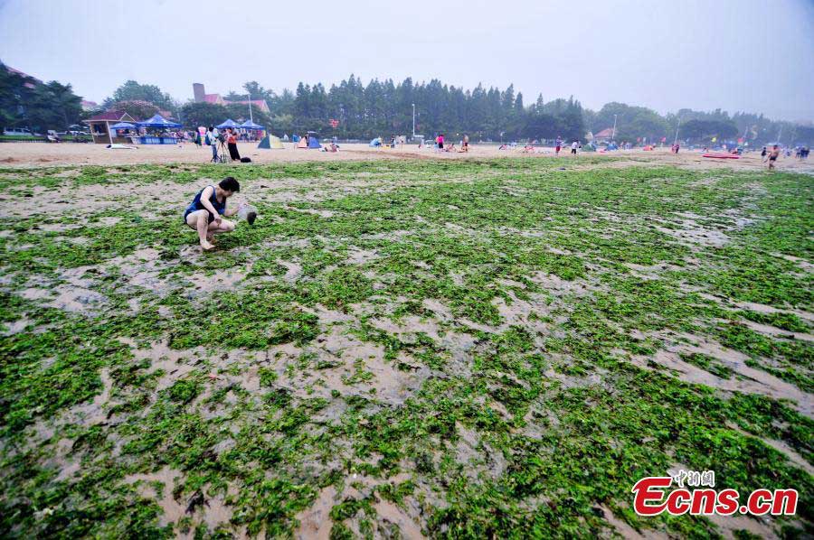 Sea lettuce, a kind of edible green seaweed, covers a beach in Qingdao, East China’s Shandong province, July 15, 2015. (Photo: China News Service/Zhong Yanming)