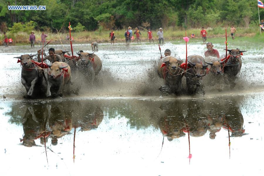 Thai buffalo racers compete during an annual buffalo racing in Chonburi Province, Thailand, July 19, 2015. (Xinhua/Rachen Sageamsak)