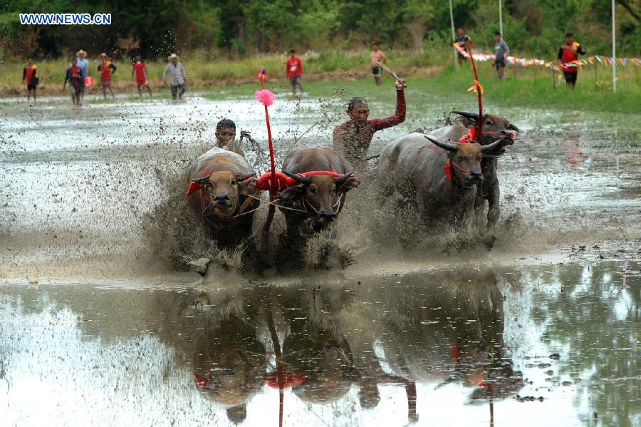 Thai buffalo racers compete during an annual buffalo racing in Chonburi Province, Thailand, July 19, 2015. (Xinhua/Rachen Sageamsak)