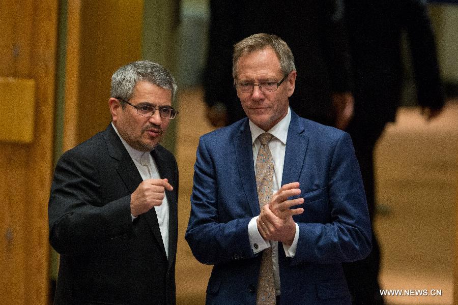 Iranian Ambassador to the United Nations Gholam Ali Khoshrou(L), speaks with Gerard Jacobus van Bohemen, President of the UN Security Council, after the UN Security Council endorsed Iran nuclear deal at the UN headquarters in New York, July 20, 2015. The UN Security Council on Monday has endorsed the newly-reached agreement between Iran and major world powers on Iranian nuclear issues, kicking off a process to lift UN sanctions on Iran. (Xinhua/Li Muzi)