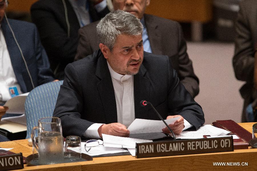 Iranian Ambassador to the United Nations Gholam Ali Khoshrou speaks after the UN Security Council endorsed Iran nuclear deal at the UN headquarters in New York, the United States, on July 20, 2015. The UN Security Council on Monday endorsed the newly-reached agreement between Iran and major world powers on Iranian nuclear issues, kicking off a process to lift UN sanctions on Iran. (Xinhua/Li Muzi)