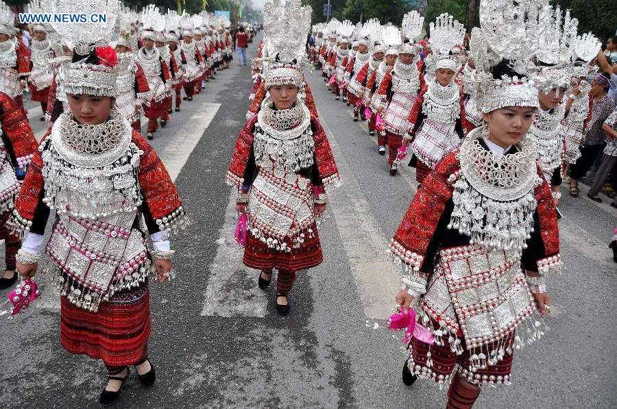 Women of Miao ethnic group participate in a parade during the Yang'esha Cultural Festival in Jianhe County, southwest China's Guizhou Province, July 21, 2015. Various activities will be held during the festival in the name of Yang'esha, the goddess of beauty in Miao ethnic group. (Xinhua/Yang Wenbin)