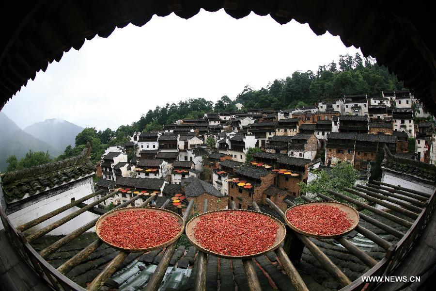 Photo taken on July 21, 2015 shows hot peppers dried in Huangling Village of Wuyuan County, east China's Jiangxi Province. As a traditional custom, people dry crops on bamboo baskets outside houses during the rainy season every year in Huangling, an ancient village surrounded by green mountains. (Xinhua/Shi Guangde)