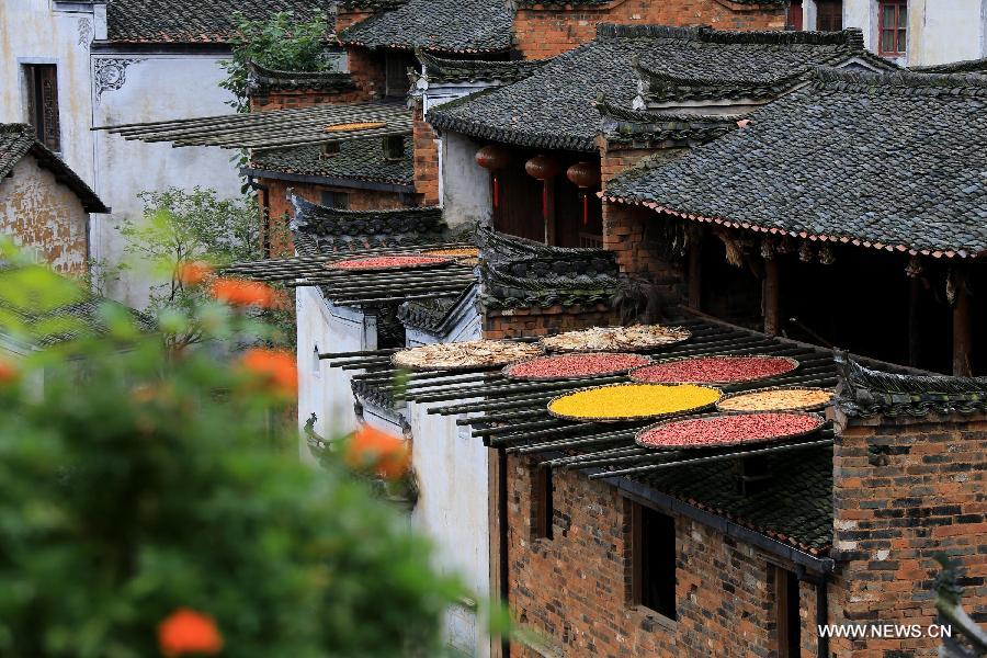 Photo taken on July 21, 2015 shows crops dried in Huangling Village of Wuyuan County, east China's Jiangxi Province. As a traditional custom, people dry crops on bamboo baskets outside houses during the rainy season every year in Huangling, an ancient village surrounded by green mountains. (Xinhua/Shi Guangde)