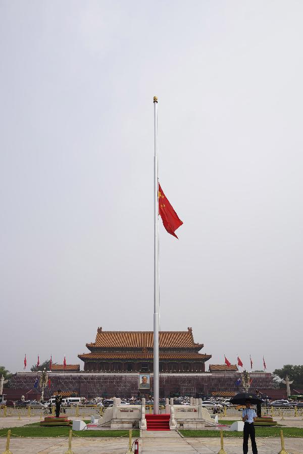 | The national flag of China flies at half mast on the Tian'anmen Square in Beijing, capital of China, July 22, 2015, to mourn Wan Li, former chairman of the National People's Congress (NPC) Standing Committee, who died in Beijing on July 15. (Xinhua/Chen Yichen) |