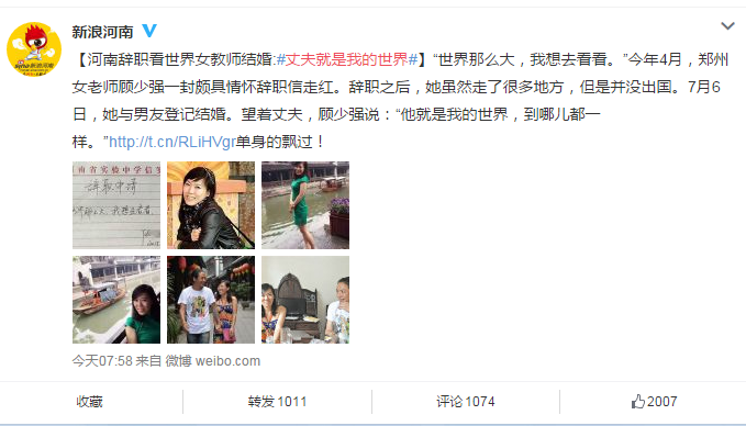 Gu Shaoqing, a middle school teacher in Zhengzhou, central China's Henan province has buzzed on social media for her 10-character resignation letter: "The world is so big, I want to explore it." Well, since resigning so memorably, she has already found love and settled down in Chengdu, Sichuan province. She got married on July 6. "My husband is my world, anytime and anywhere", said Gu.