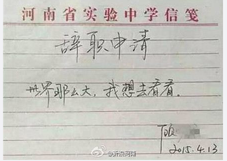 Gu's resignation letter written on April 13. It reads "the world is so big, I want to explore it".