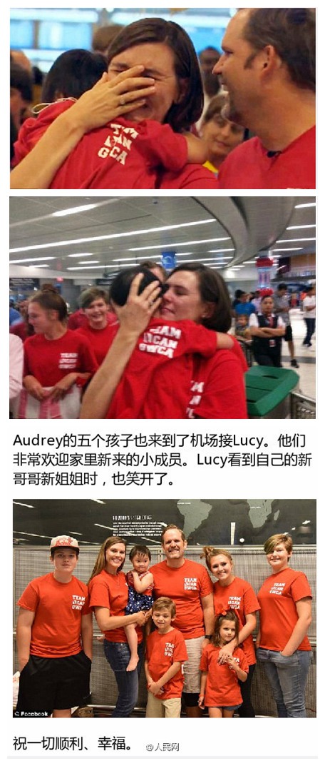 Lucy is a 6-year-old Chinese orphan with Down's syndrome. Recently she was adopted by a couple in the US. When Lucy arrived at Houston Airport, her foster parents Audrey and Brent were already waiting for her with their five children.