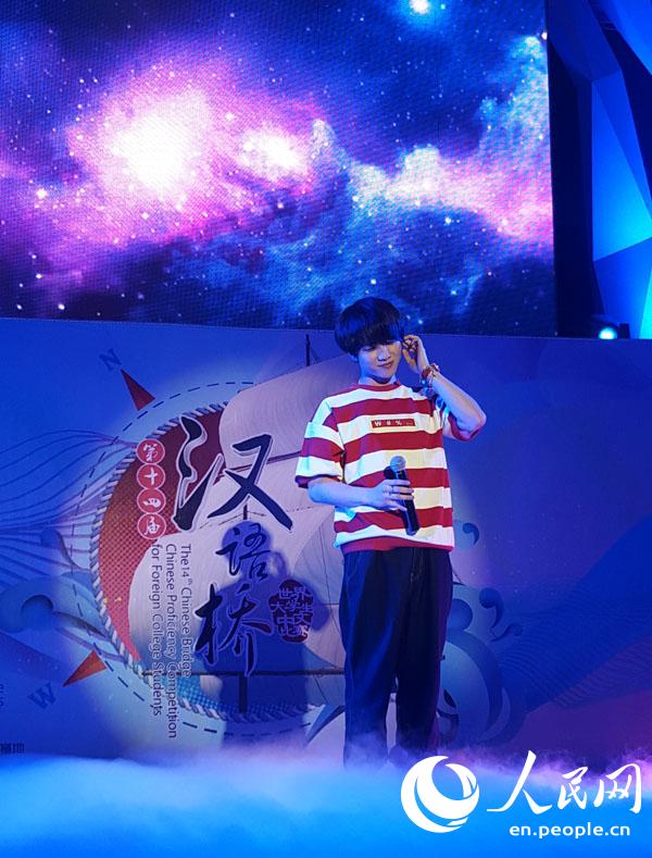 Chinese singer Hua Chenyu sings a song at the Cloisonne Promotion contest of the 14th Chinese Bridge Competition for Foreign College Students in Beijing, July 22, 2015. (People's Daily Online/Du Mingming)