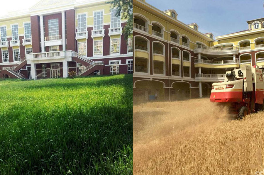 In October 2014, considering winter was coming, the president of No. 24 Middle School of Shijiazhuang, Hebei province, made a decision to grow wheat on campus instead of other plants, when they planned to conduct campus greening as the new school building was put into use. In June, the school reaped over 1000 kg of wheat, which will be consumed by the school canteen. (Photo / CCTV)