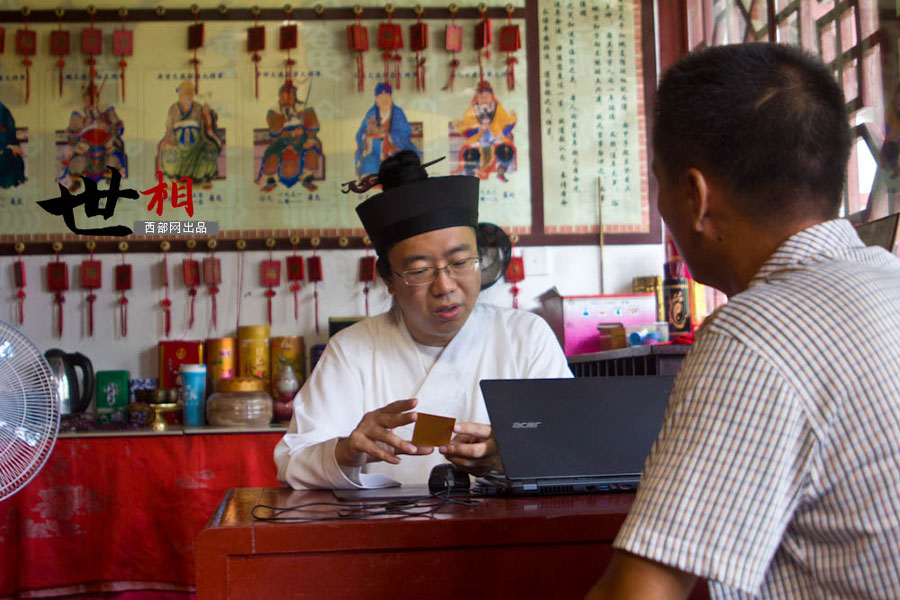 Liang receives a man who asks for drawing fortune sticks. (Photo/cnwest.com)