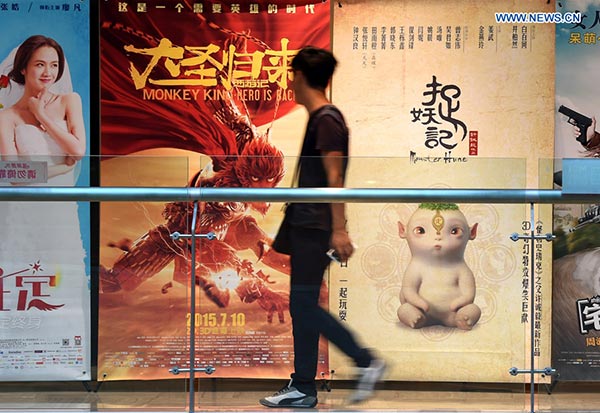 A man walks past a poster of the "Monster Hunt" (right) at a cinema in Shenyang, capital of northeast China's Liaoning province, July 26, 2015. [Photo/Xinhua]