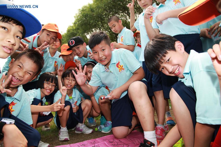 Campers pose for a photo during a summer camp in Beijing, capital of China, July 27, 2015. Over 200 young pioneers around China participated in the camp, experiencing traditional Chinese culture in Beijing. (Xinhua/Li Fangyu)