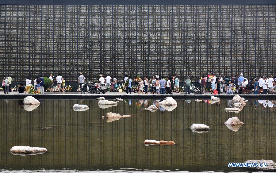 People offer flowers to relatives dead in the 1976 Tangshan earthquake in front of the memorial wall in Tangshan, north China's Hebei Province, July 28, 2015. Local residents came to the memorial park on Tuesday to commemorate the 39th anniversary of the Tangshan earthquake. (Xinhua/Li Junyi)