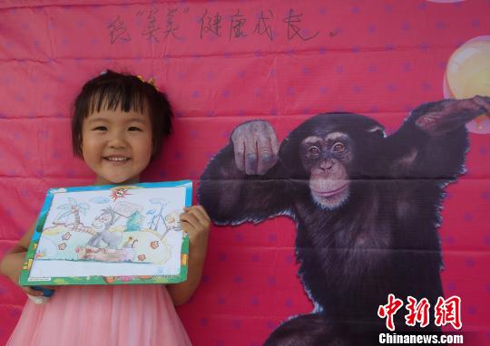 | A child poses for photo at Nanshan Park in Yantai city, east China's Shandong province, July 26, 2015. To celebrate the birthday for the chimpanzees, the park had also invited dozens of children who were born in July to enjoy the birthday cake together. (CNS/Ren Yi) |