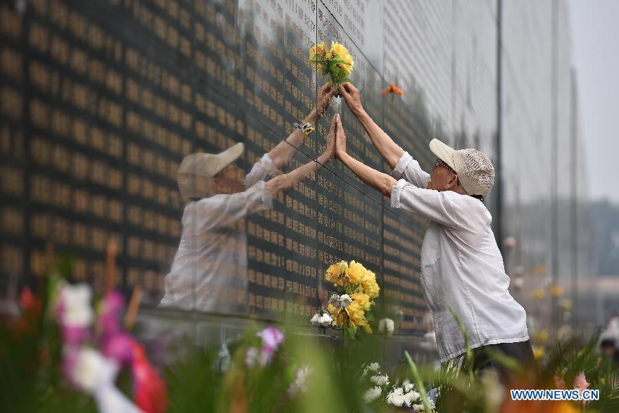 People mourned the victims of the Tangshan earthquake in front of the Victim Memorial Wall on July 28, 2015 to mark the 39th anniversary of the deadly disaster in Tangshan, Hebei province, China.