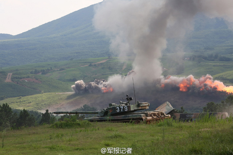 | The air force, army aviation, armored force, special operations force of the PLA jointly conduct a live fire drill in east China’s Anhui province on July 27, 2015. (Photo/Weibo of PLA Daily’s reporters) |