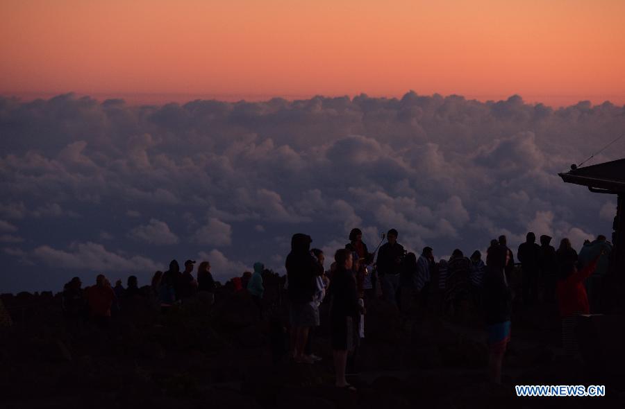 People wait to watch the sunrise at Haleakala National Park in Maui, Hawaii, the United States, July 29, 2015. (Xinhua/Yin Bogu)