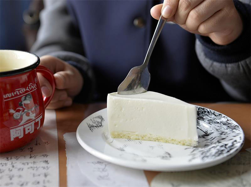 A customer digs into a home-made yoghurt cake in "Accordion", July 28, 2015. [Photo/Xinhua]