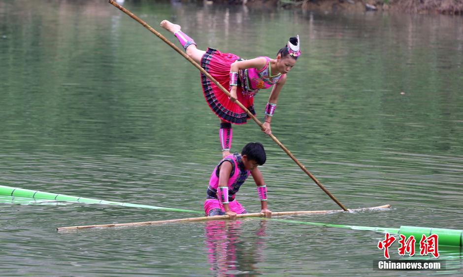 Middle school students practice single bamboo drifting in Rongjiang county, southwest China's Guizhou province on July 30, 2015. Single bamboo drifting is a traditional sport of Dong people. The rower stays on a single bamboo and makes different actions when drifting. The drifting team will compete in the 10th National Games held in Inner Mongolia in early August. (Photo/CNS)