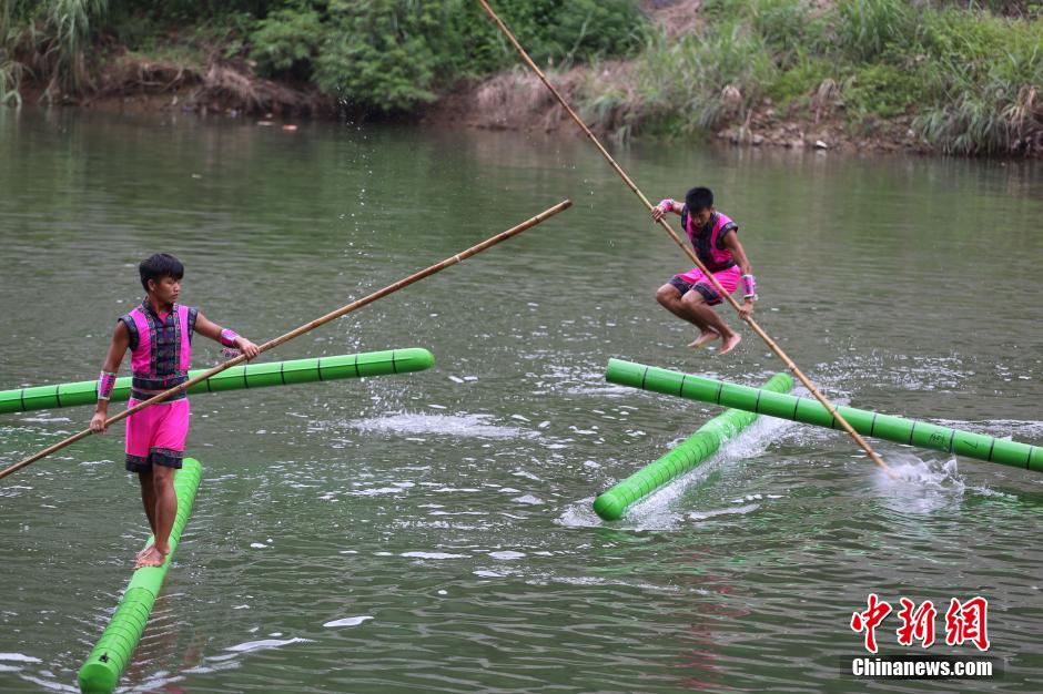Middle school students practice single bamboo drifting in Rongjiang county, southwest China's Guizhou province on July 30, 2015. Single bamboo drifting is a traditional sport of Dong people. The rower stays on a single bamboo and makes different actions when drifting. The drifting team will compete in the 10th National Games held in Inner Mongolia in early August. (Photo/CNS)