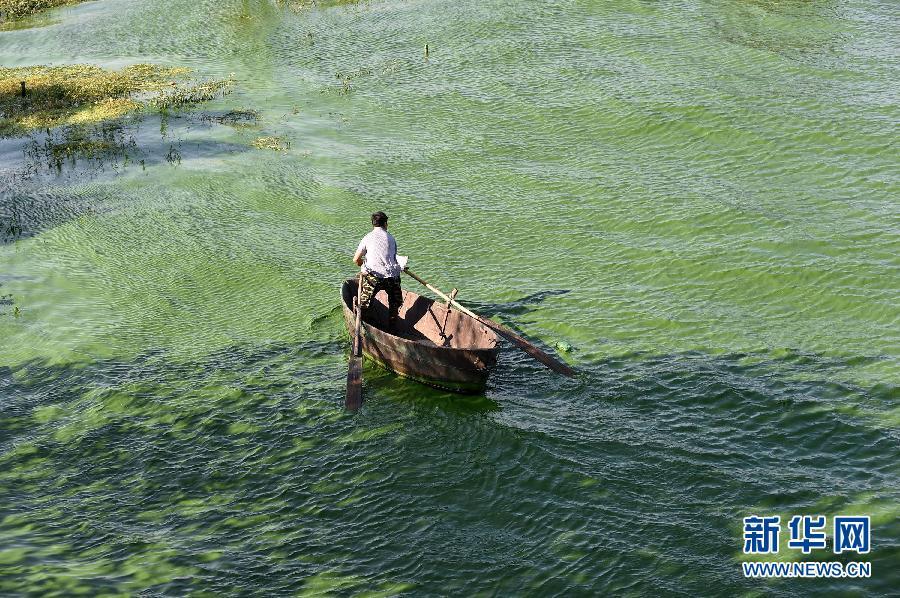 | A fisherman rows a boat in the Chaohu Lake full of blue-green alga on July 30, 2015. As the temperature keeps climbing in summer, blue-green alga gather in parts of Chaohu Lake, Anhui province. (Photo by Xinhua News Agency/Yang Xiaoyuan) |